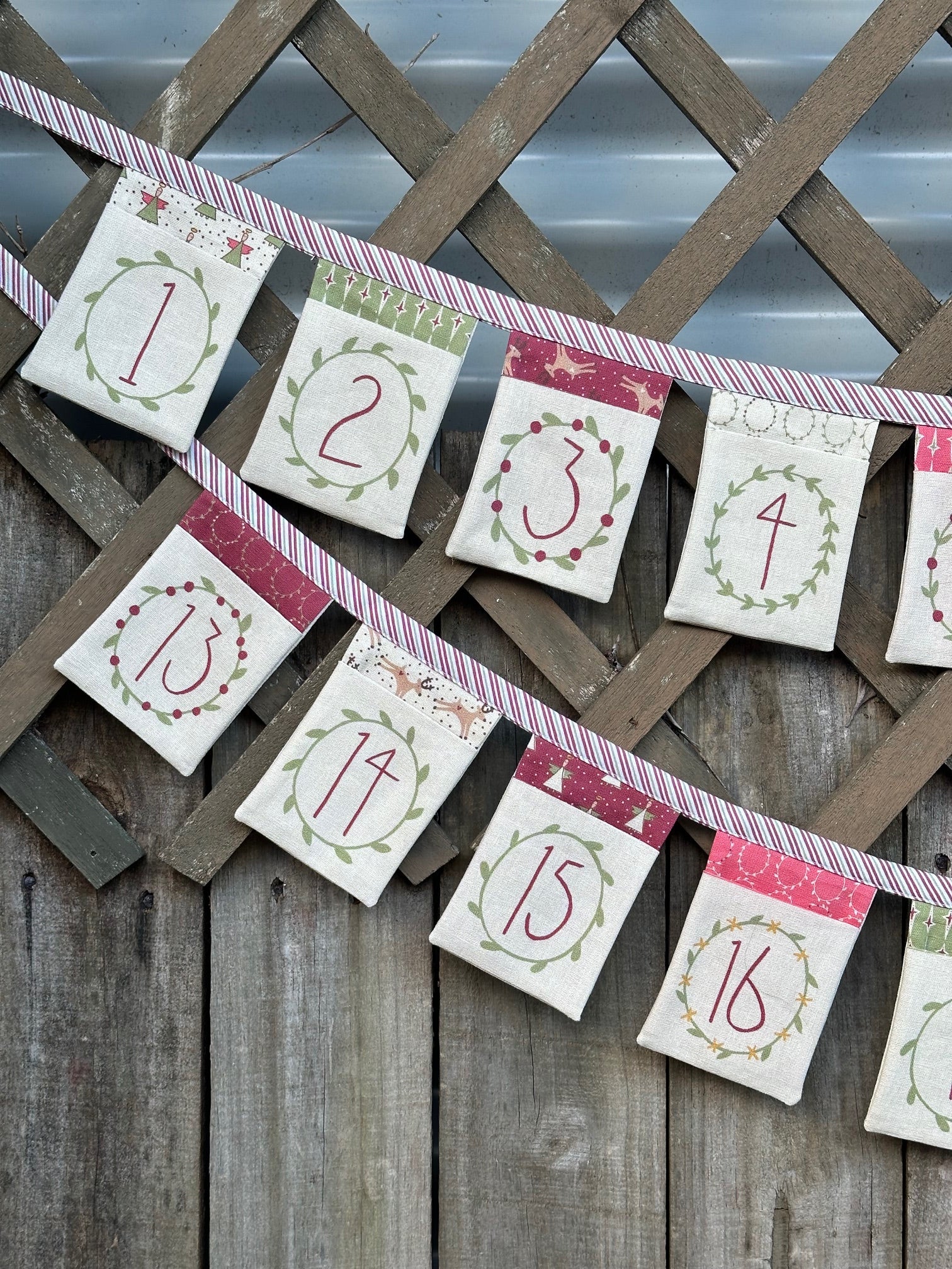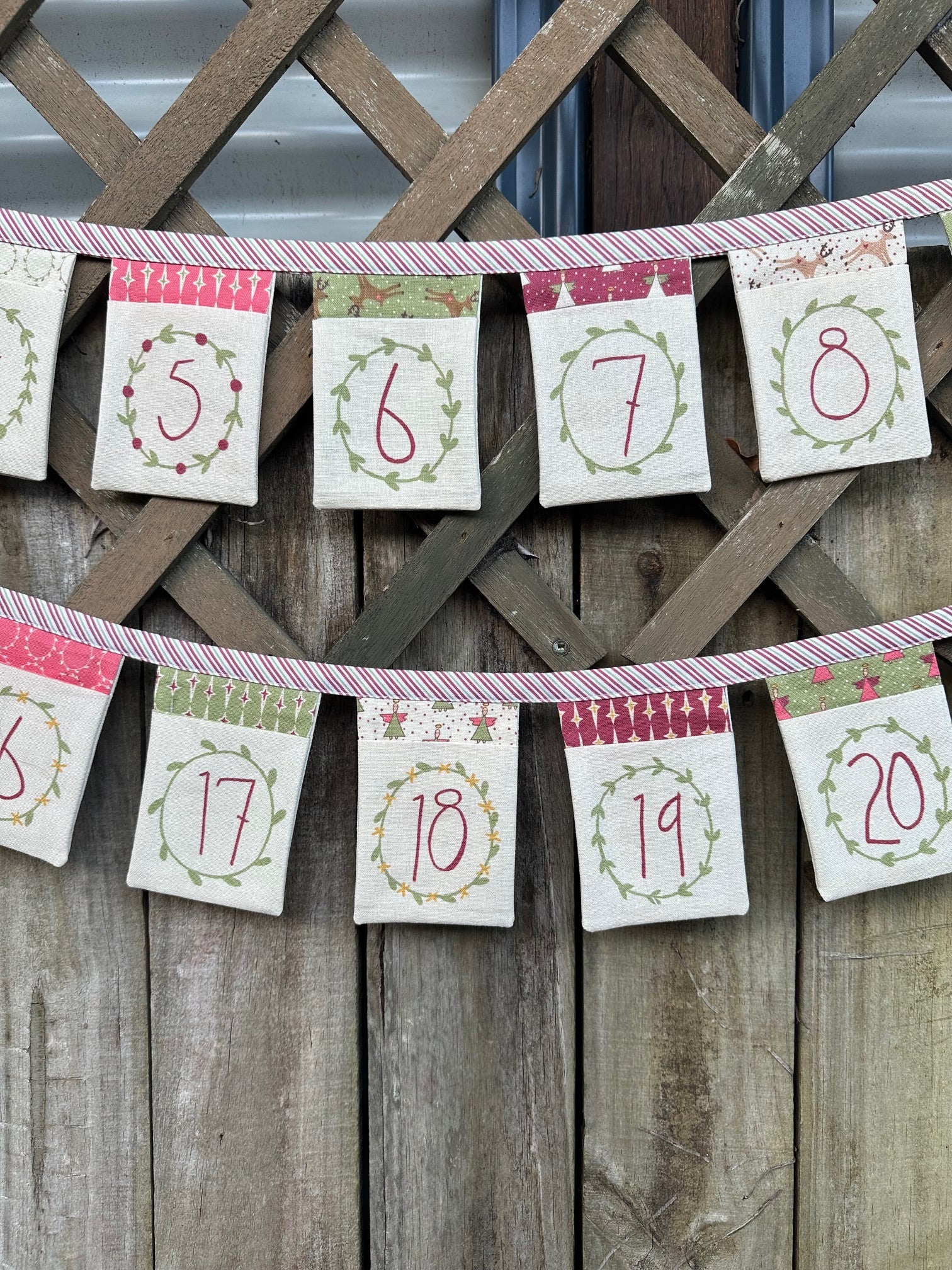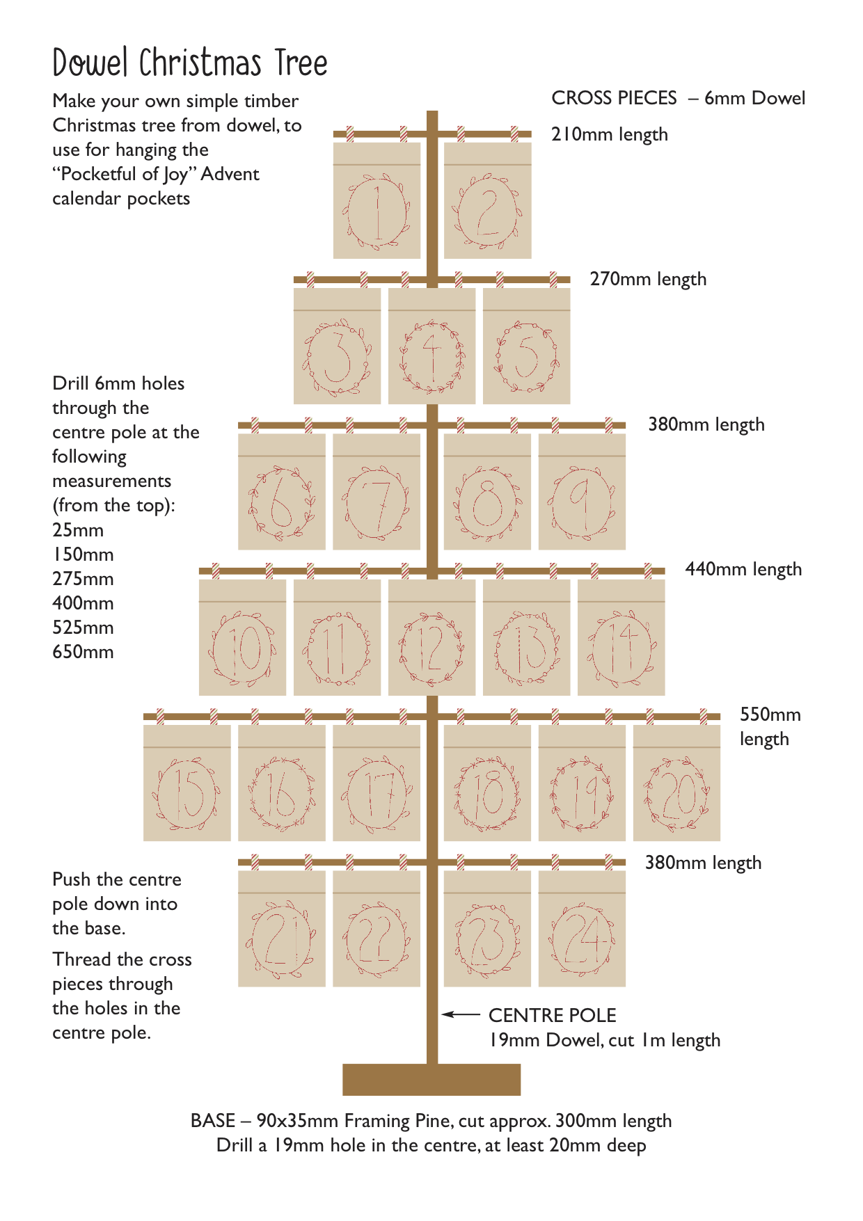 The pockets can be made into a bunting, or used individually by adding small hanging loops and threading onto a dowel Christmas tree or anything else you wish to do with them. (See pic with instructions for Dowel Christmas Tree)