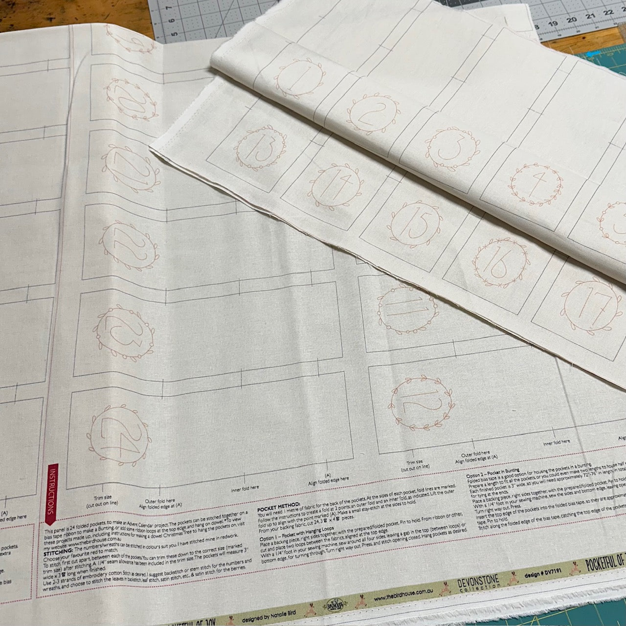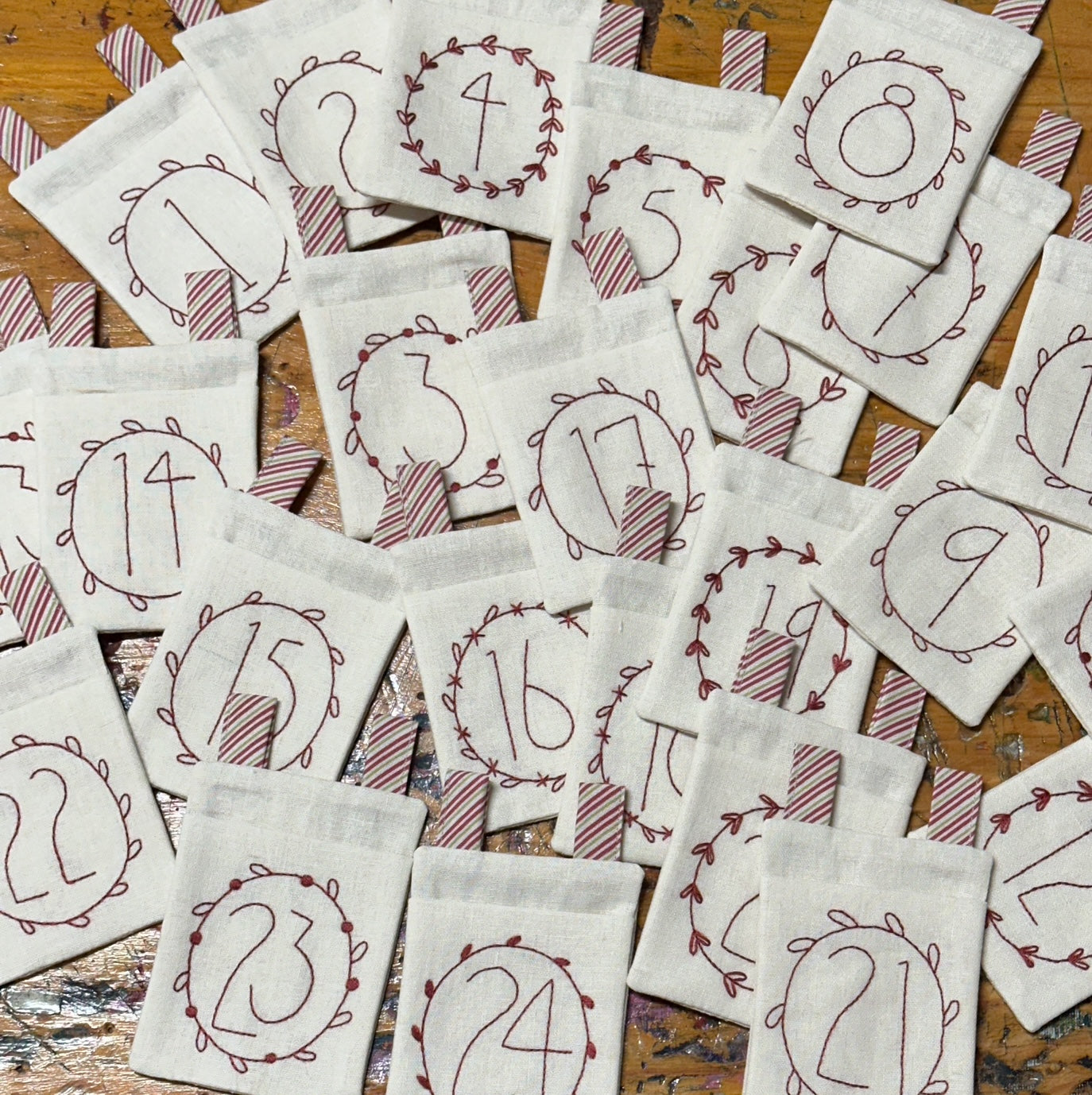 A pre-printed stitchery panel to make 24 Advent Calendar pockets, to be stitched with red embroidery thread, or your favourite festive colour.